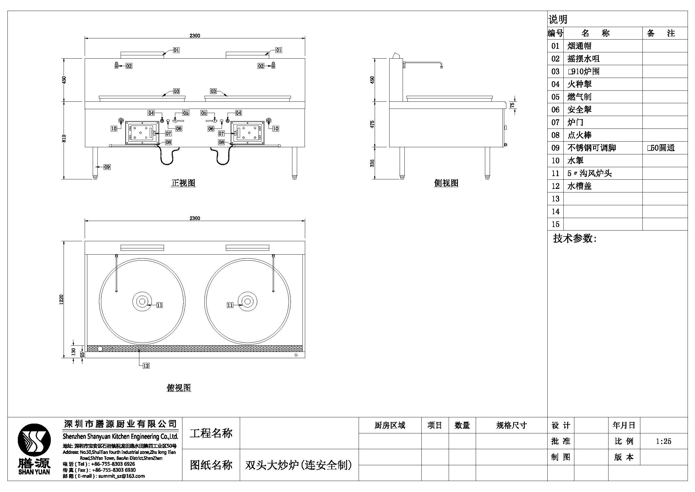 1、炒炉台面采用304不锈钢整体拉伸成型,方便清洁,下面采用铁板钢架支撑,中间附设玻璃纤维隔热层,炉脚高度可在一定范围内任意调节。